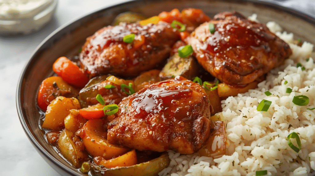 This skillet dinner features juicy chicken thighs coated in a rich brown sugar bourbon glaze, cooked to perfection in one pan. The recipe takes about 30 minutes from start to finish and serves 4 people.