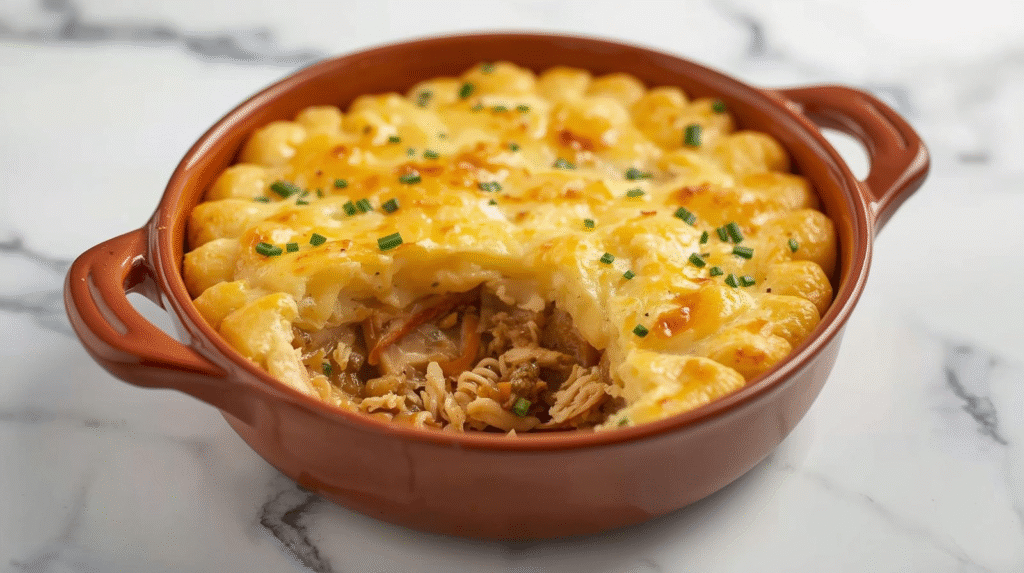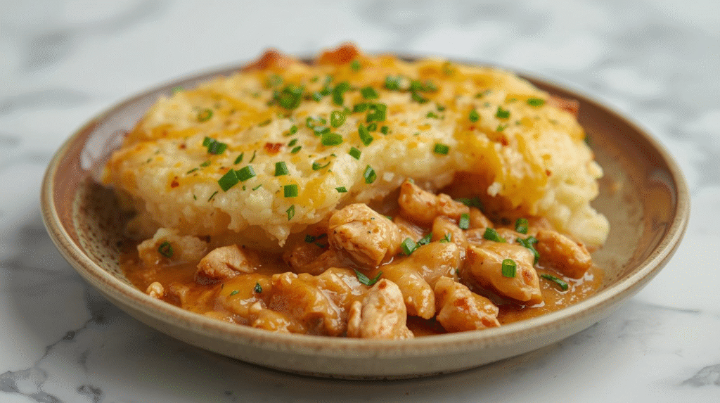This shepherd’s pie features a savory ground chicken filling cooked in a rich gravy, topped with a smooth cheddar chive cauliflower mash. The recipe takes about 1 hour from start to finish and serves 6 people.