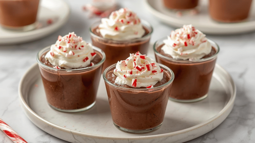- Prepare the Glasses: Rim shot glasses with chocolate syrup and dip in crushed candy canes for a festive touch.