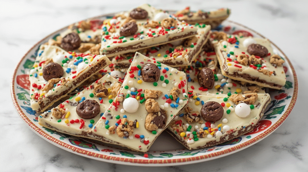 - Combine Ingredients: Pour the melted chocolate onto the prepared baking sheet and spread it into an even layer. Sprinkle the crushed cookies, mini chocolate chips, and holiday sprinkles evenly over the top.
