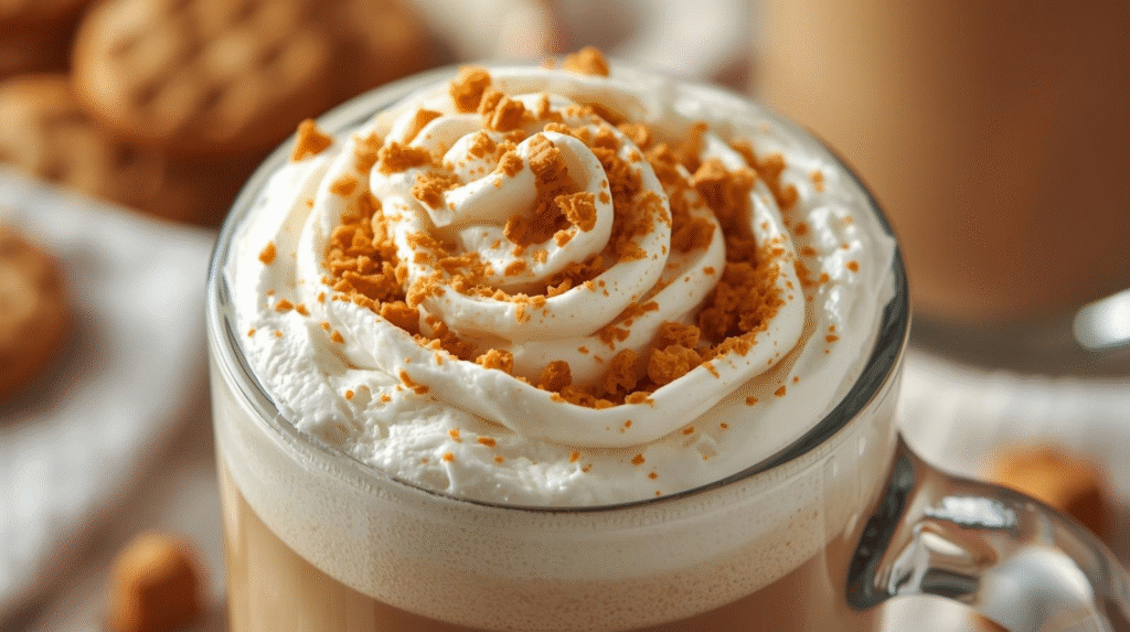 - Top: Add whipped cream on top and sprinkle with crushed Biscoff cookies and a dash of cinnamon or nutmeg if desired.