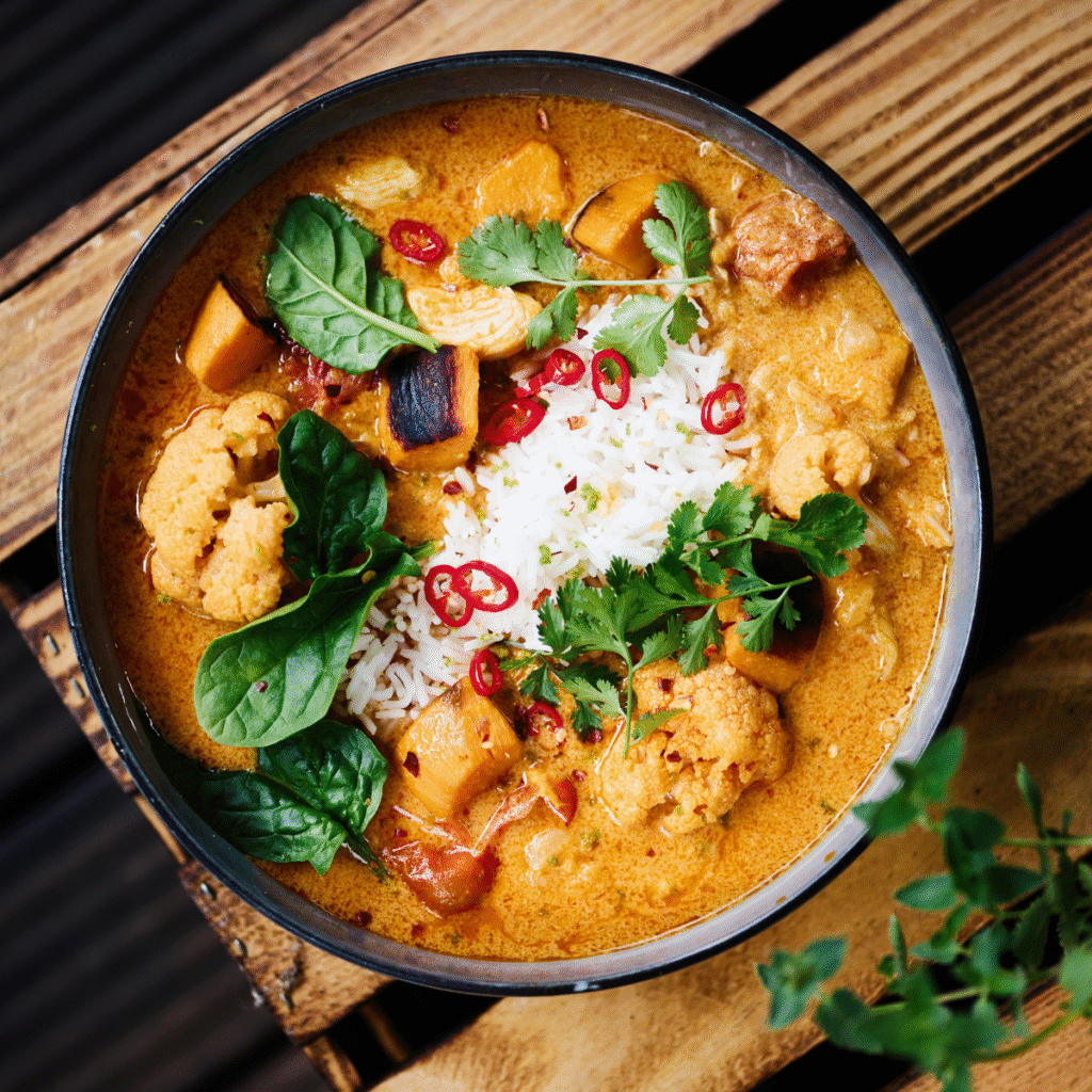 Transport your kitchen to Southeast Asia with this incredibly vibrant and comforting coconut curry. Imagine tender chunks of chicken, sweet potato, and cauliflower all simmering together in a luxuriously creamy and fragrant red curry-coconut broth. Served over fluffy jasmine rice and finished with fresh cilantro and a pop of chili, this dish is a perfect harmony of sweet, savory, and spicy. It’s a stunning, soul-warming meal that comes together in one pot, making it perfect for any night of the week.