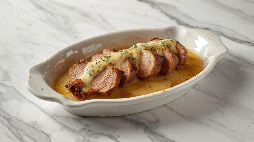 - Serve: Slice the pork tenderloin and serve it with the creamy sauce drizzled on top. Garnish with fresh parsley before serving.