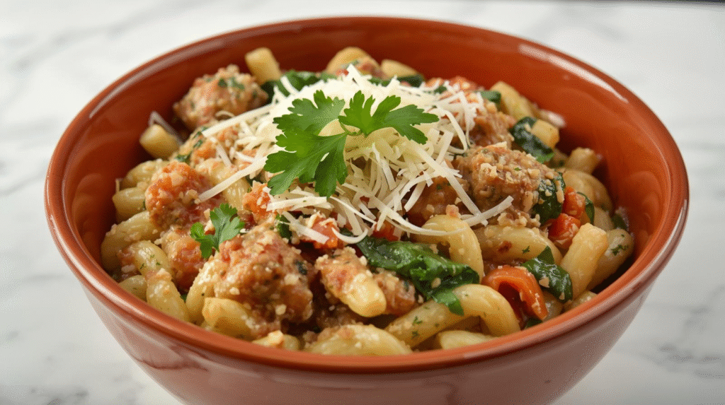 - Serve: Ladle the creamy sausage and spinach orzo into bowls. Top with grated Parmesan cheese and chopped parsley if desired.