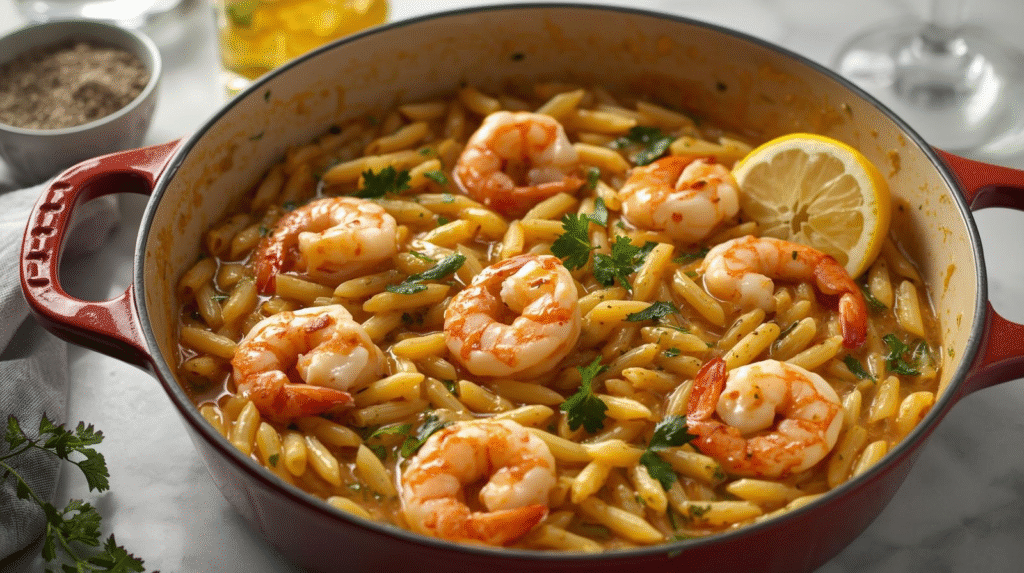 This recipe features shrimp cooked in a creamy white wine sauce with orzo pasta, garlic, and herbs. It takes about 30 minutes to prepare and serves 4 people, making it a quick yet elegant option for any occasion.