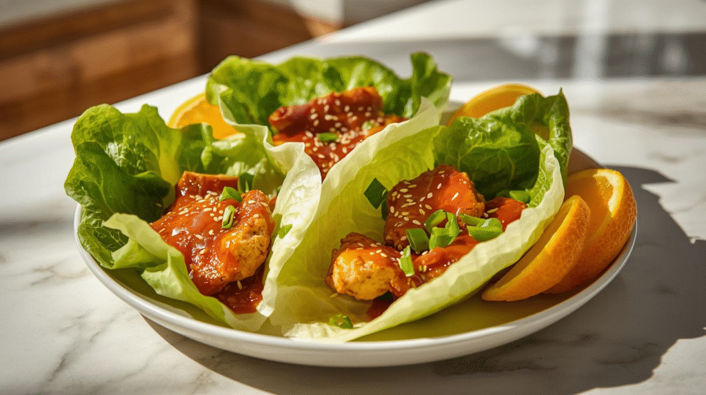 This recipe is quick and easy, making it ideal for busy weeknights. The combination of fresh lettuce and savory orange chicken wraps creates a satisfying dish that is both nutritious and delicious.