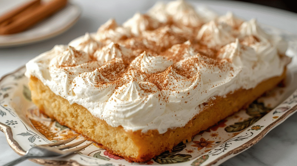 - Make the Whipped Topping: In a mixing bowl, beat the heavy cream and powdered sugar until stiff peaks form. Spread the whipped cream over the soaked cake and sprinkle with cinnamon and nutmeg.