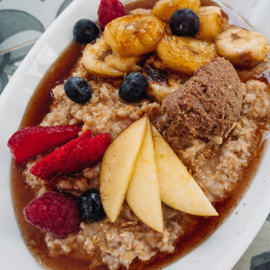 - Arrange the Toppings: Artfully arrange the warm caramelized bananas, fresh berries, and apple slices on top of the oatmeal.