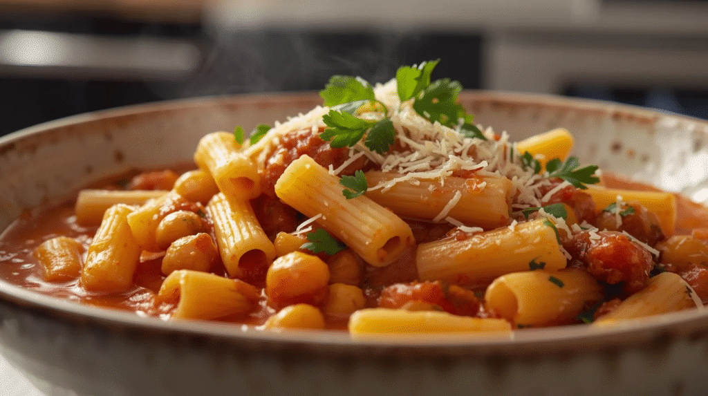 This comforting Italian bowl features pasta cooked with chickpeas in a savory broth, seasoned with garlic, herbs, and a touch of tomato. The recipe takes about 30 minutes from start to finish and serves 4 people.