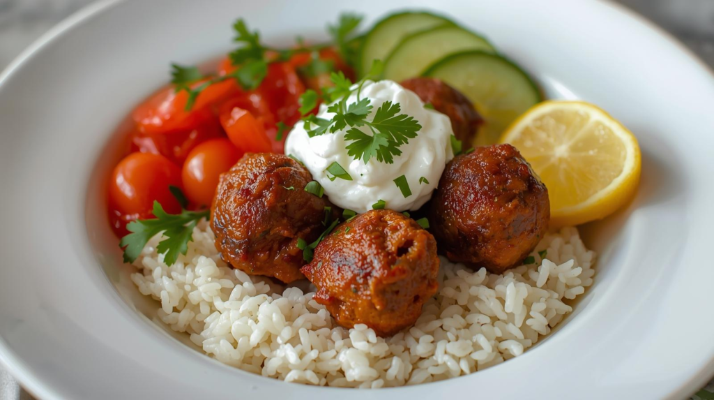 - Assemble the Bowls: In serving bowls, layer cooked rice or quinoa, top with kofta, diced cucumber, and cherry tomatoes.