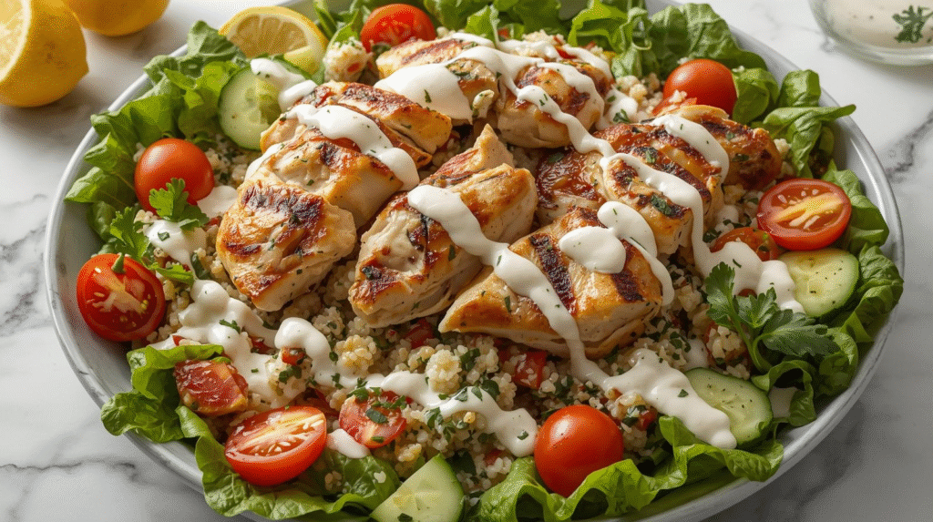 - Serve: Top the quinoa salad with sliced grilled chicken and drizzle with zesty yogurt dressing. Enjoy!