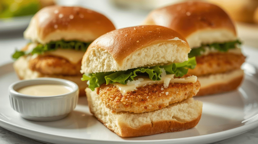 - Assemble Sliders: Spread the Caesar-yogurt mix on the bottom half of each toasted slider roll. Layer with sliced chicken, shredded romaine lettuce, and a sprinkle of Parmesan cheese. Top with the other half of the roll.