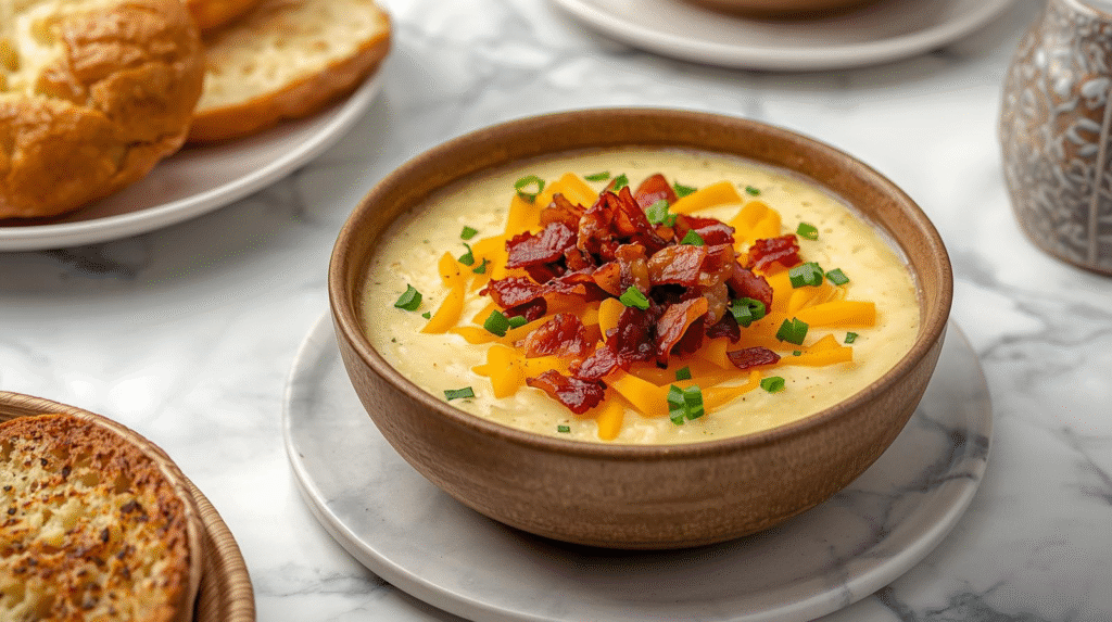 This stovetop recipe features diced potatoes cooked in a rich broth, blended with cream, and topped with crispy bacon and cheddar cheese. The entire process takes about 45 minutes and serves 6 people.