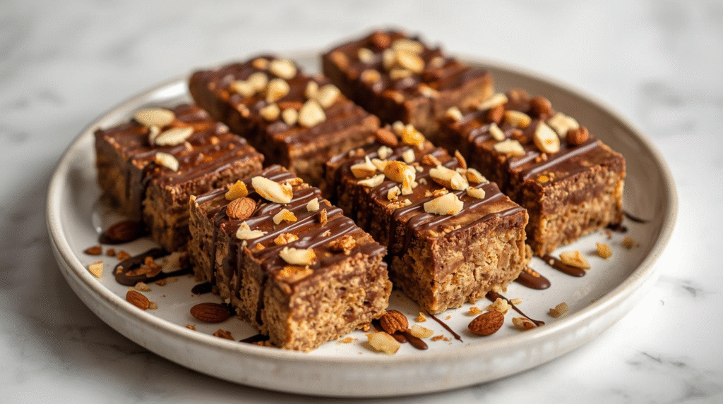 These no-bake chocolate almond protein bars are a perfect high protein snack for anyone looking to fuel their day. Made with almond butter and topped with a delightful chocolate drizzle, they provide a delicious energy boost recipe that is easy to prepare.