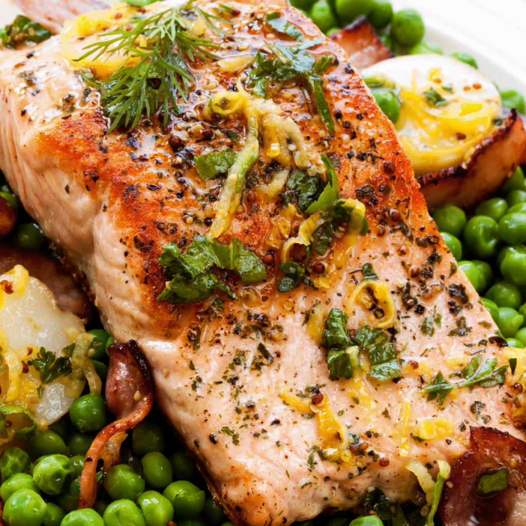 Imagine a perfectly golden, pan-seared salmon fillet, resting on a vibrant bed of sweet green peas studded with salty, crispy bacon. This dish brings together classic, comforting flavors in a way that feels both elegant and incredibly easy to prepare. What makes it so special is the bright, zesty lemon-dill vinaigrette that gets drizzled over everything, tying the rich salmon, savory bacon, and sweet peas together in perfect harmony. It’s a restaurant-quality meal you can have on your table in under 30 minutes, making it ideal for a sophisticated weeknight dinner or a light, satisfying lunch.