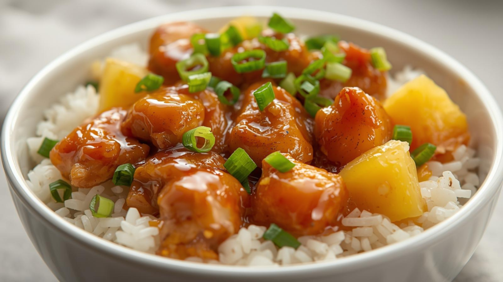- Assemble the Bowls: Divide the cooked rice among four bowls. Top each bowl with the honey garlic chicken and diced pineapple.