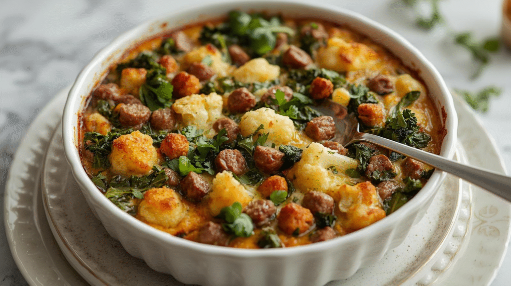 This savory casserole combines turkey sausage, kale, and cauliflower to create a delicious low carb Thanksgiving side or main dish. It’s a high-protein, keto-friendly option that makes for a perfect holiday casserole.