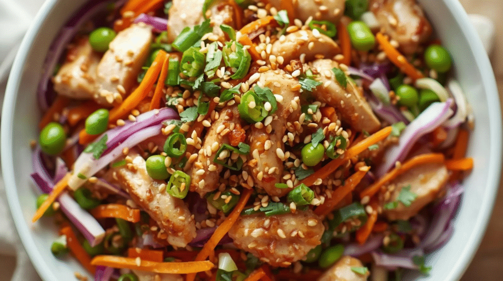- Combine the Salad: In a large mixing bowl, combine the shredded chicken, cabbage, carrots, edamame, and green onions.