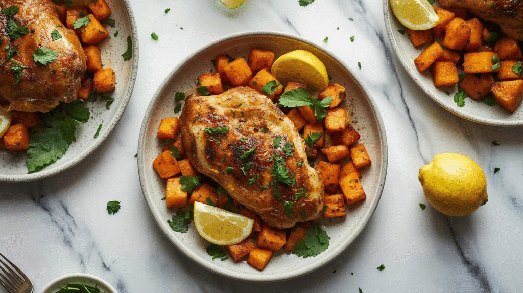 - Roast the Chicken and Sweet Potatoes: Place the marinated chicken thighs on the sheet pan with the sweet potatoes. Roast in the preheated oven for 25-30 minutes, or until the chicken is cooked through and the sweet potatoes are tender.
