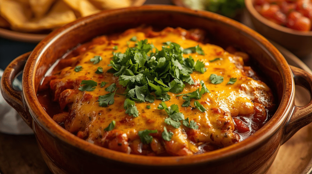 This casserole features layers of shredded chicken, enchilada sauce, tortillas, and cheese, all cooked together in a slow cooker for a rich and flavorful dish. The recipe takes about 6 hours on low and serves 6-8 people.