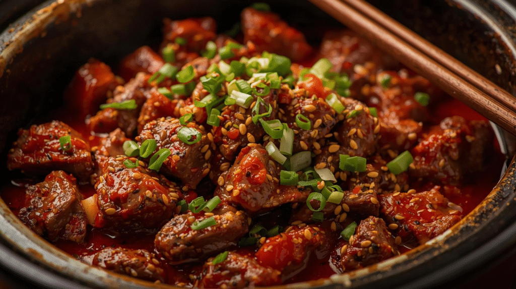 - Slow Cook: Place the beef in the slow cooker and pour the sauce over it. Stir to coat the beef evenly. Cover and cook on low for 8 hours or high for 4 hours until the beef is tender.