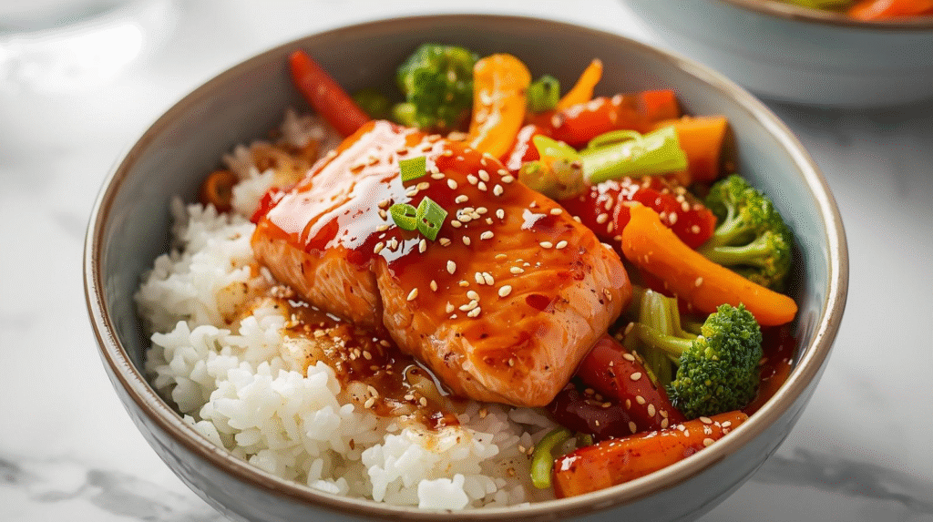This Sweet Chili Teriyaki Salmon Rice Bowl is a delicious and healthy dinner option that combines tender salmon with a flavorful teriyaki sauce. Served over a bed of rice, this Asian-inspired dish is perfect for a quick weeknight meal.