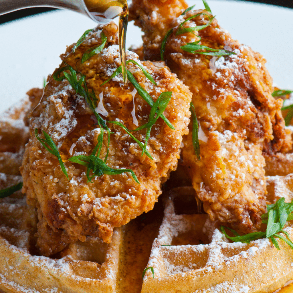 - Serve and Enjoy: Place a hot waffle on each plate. Top with a piece of crispy fried chicken. Dust generously with powdered sugar, drizzle with plenty of warm maple syrup, and garnish with sliced chives. Serve immediately and enjoy the incredible combination of flavors and textures!