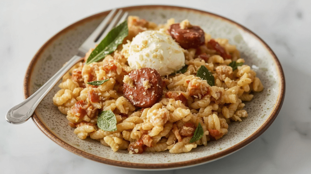 This orzotto features tender orzo pasta cooked with turkey sausage and fresh sage, finished with creamy cottage cheese for added richness. The recipe takes about 30 minutes to prepare and serves 4 people.