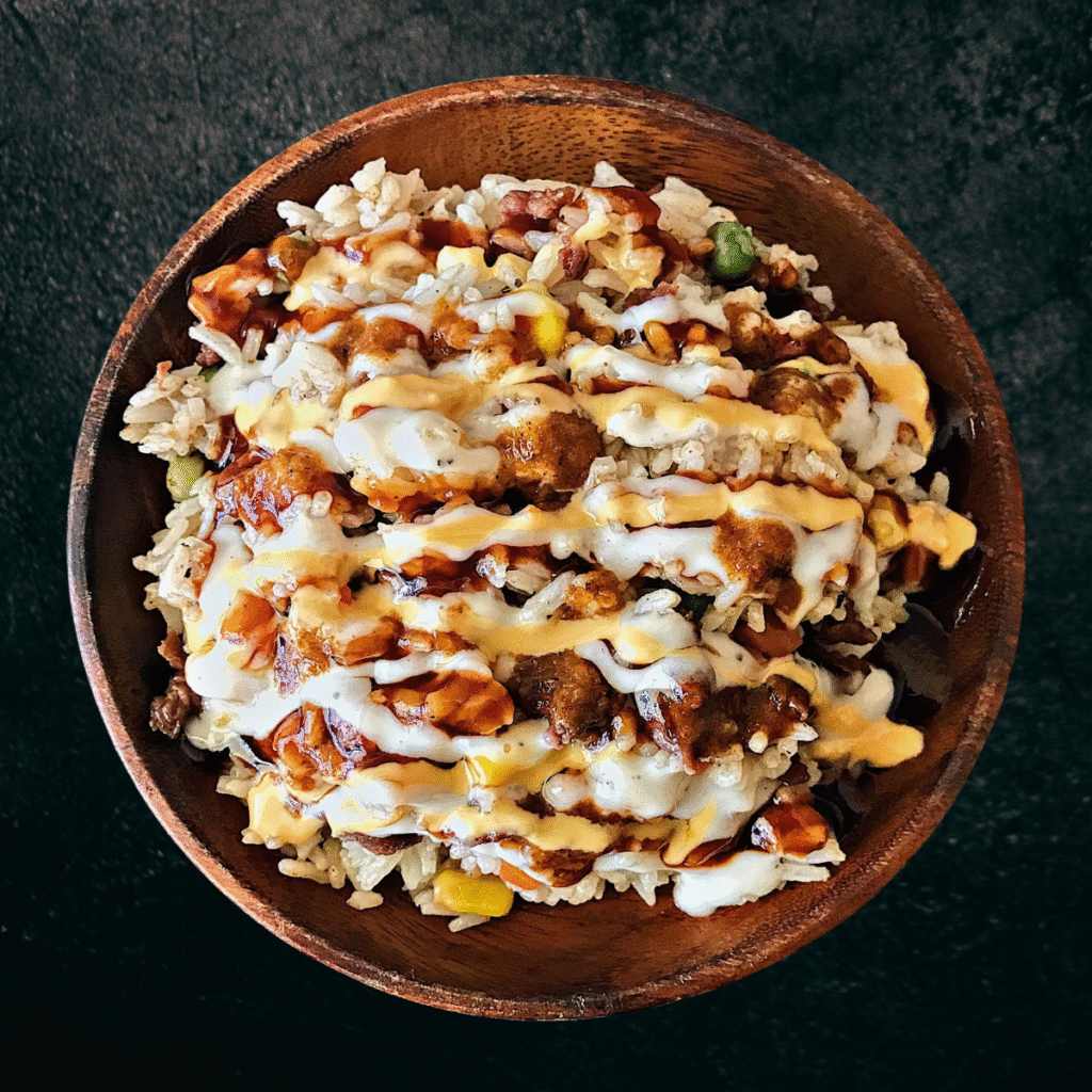 - Assemble and Serve: Divide the hot fried rice between two large bowls. Top each bowl generously with the crispy chicken. Drizzle the Sweet Soy Glaze, Spicy Mayo, and Garlic Aioli all over the top in a zigzag pattern. Serve immediately and enjoy the flavor explosion!