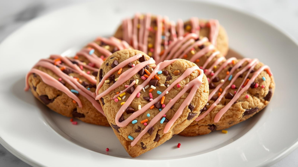 These delightful heart-shaped cookies are perfect for celebrating Valentine’s Day. Made with rich chocolate chips and topped with a sweet pink drizzle, they are a charming treat to share with loved ones.